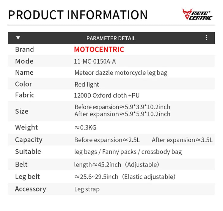 SPECIFICATIONS Applicable: Motorcycle, Motorbike, Cruiser, Touring Brand Name: MOTOCENTRIC Choice: yes Color: Blue/Green/Red Light Feature: with LED Bag Fit: Motorcycle... Read more