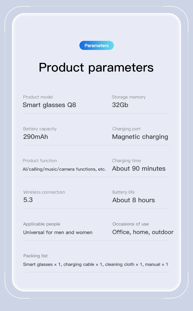 SPECIFICATIONS Applicable Scenarios: Casual Auto Focus: Yes Battery Capacity: 290mAh Battery Included: Yes Battery Life: About 8 hours Bluetooth-compatible Version:... Read more